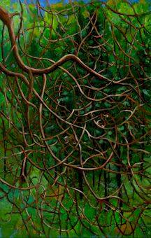 I am intrigued by the continuum between chaos and order from seemingly random forms to highly regular ornamental ones. Reading about fractals in nature, I see their patterns in the dead branches of an incense cedar. From their apparent randomness, a symmetric geometric star weaves itself into being. |